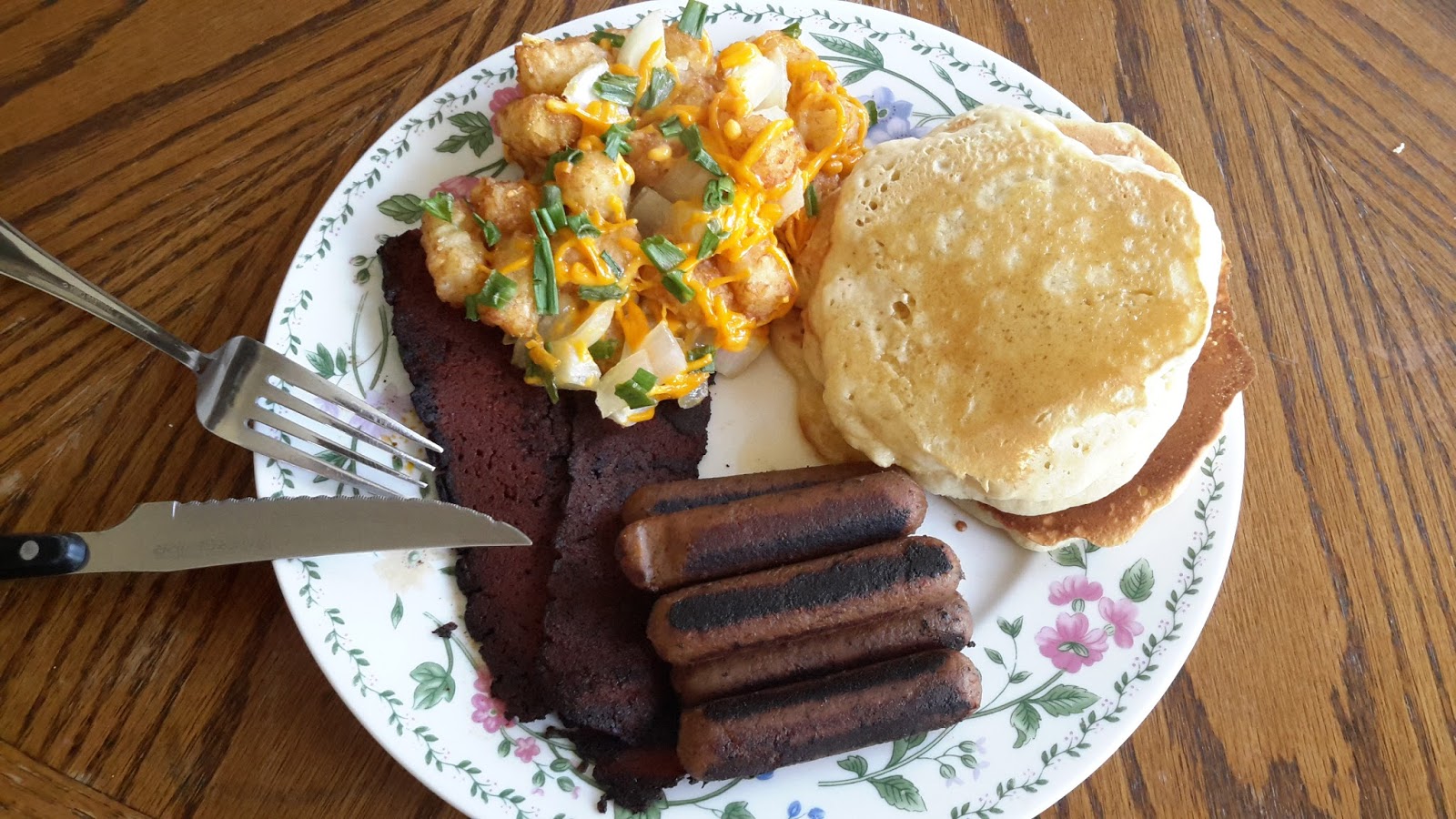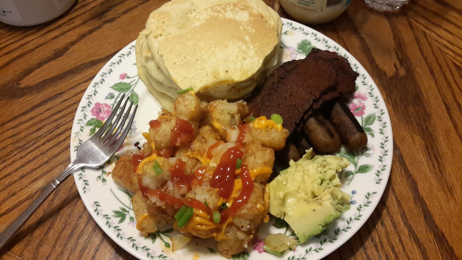 To Serve the "Traditional Way" Heap a mound of Cheese Tots onto your plate, Slap down 3-4 Pancakes next to it, then add on a portion of your favorite Breakfast Sausage, a portion of your favorite bacon, with half an avocado on the side. Serve with ketchup and mayo for the tots, and Maple Syrup for the pancakes and sausage.