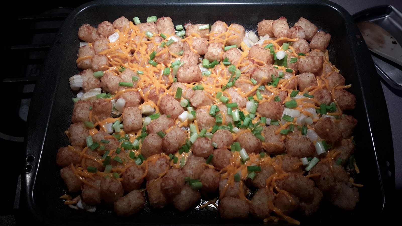 - Pop it in the oven and bake for 15-20 minutes until tots are cooked to your taste.