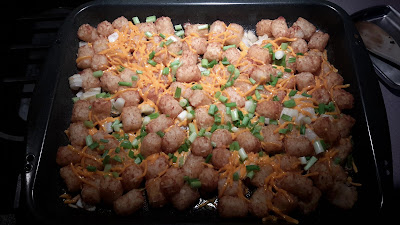 - Dump the tater tots into a baking dish with the diced onions. Drizzle a little olive oil over them then sprinkle them with salt, and garlic powder. Stir to combine everything.