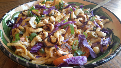 Surprisingly this turned out super good, it's got the perfect balance of sweet, salty, spicy, tangy. I also think the cashew butter makes a great stand in for peanut butter, and lends a more mellow, yet complex and nutty flavor to the dish. I also really love the nice bit of crunch in each bite from the red cabbage garnish. I didn't have any cilantro on hand, but I imagine that would make a good garnish too, if you happen to have some. Of course if you want to 'beef' it up, you could also add some cubed baked or fried tofu, or maybe even some tempeh. But I kind of like it exactly as it is, light and easy. Two of my favorite things right now.